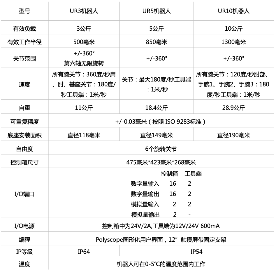 UR协作式机器人产品参数: