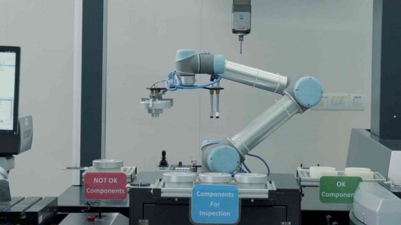 一台UR5机器人整合三种测量技术:三坐标测量机,仿形机床和一台非接触式测量机协作式机器人根据相关程序扫描每个组件的条码,将其放置到每台机器上检查。检查后,测量机向协作式机器人发送组件是否可用的信息。协作式机器人据此依次分拣零件,将零件放置在“合规”或“不合格”的箱子中。