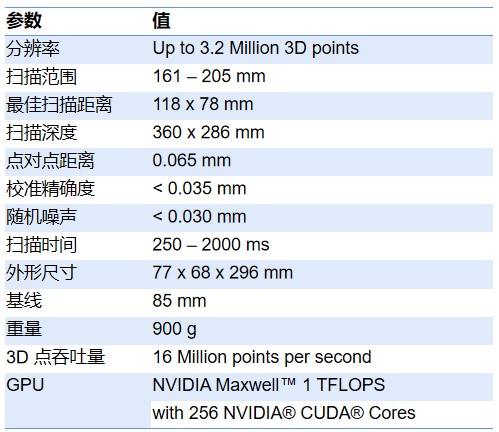 Photoneo PhoXi 3D Scanner S 参数如下: