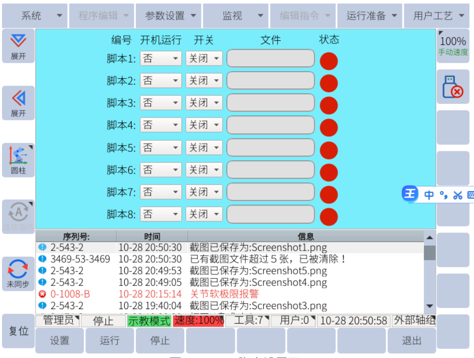 要从USB设备加载,请创建Lua脚本并将其放在USB驱动器上的/rbctrl/luadir文件夹中。如果/rbctrl/luadir文件夹不存在,请创建一个并将Lua脚本放入其中。将USB驱动器插入控制箱并导航到系统->U盘到本地->脚本升级并单击“确定”。接下来导航到用户工艺->脚本。