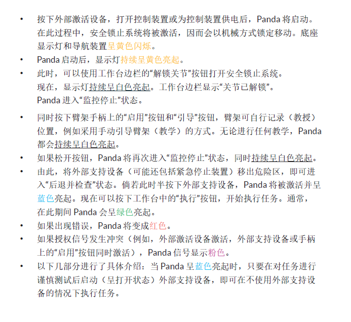 指示灯如果不是白色的时候,不能使用示教模式拖动机械臂,否则因此而造成的机械臂损坏,厂家不负责,据Franka机械臂负责人称,90%的机械臂损坏都是由于操作人员没有按正确的方法拖动机械臂引起的。