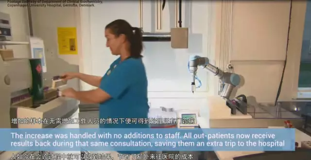 位于根托夫特的哥本哈根大学医院采用了两台UR5机器人。机器人每天处理3,000个血样,每分钟7至8个。第一个机器人使用小型气动吸盘,拾取输送机上经由管道系统到达的样本,视觉系统引导机器人将样本放置在条形码读取器中,条形码读取器还将拍摄螺旋帽的颜色,并将样本转移到正确颜色的支架上。第二台UR5机器人从机架中拾取样本,并将其放入入口模块中,将样本送往离心分析和后续分析环节。